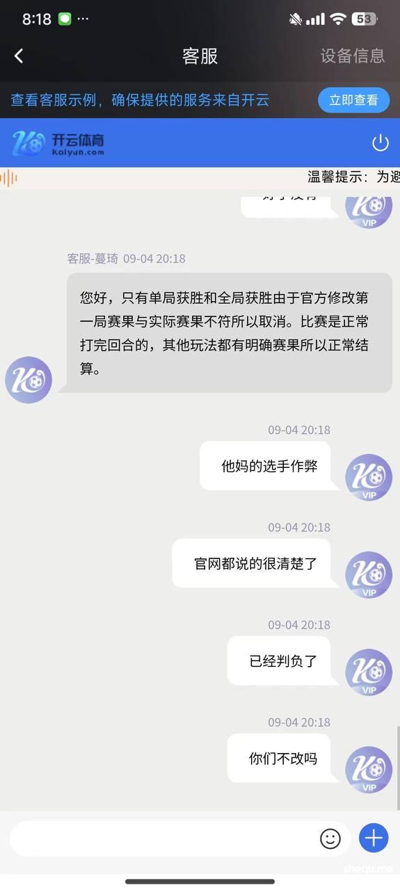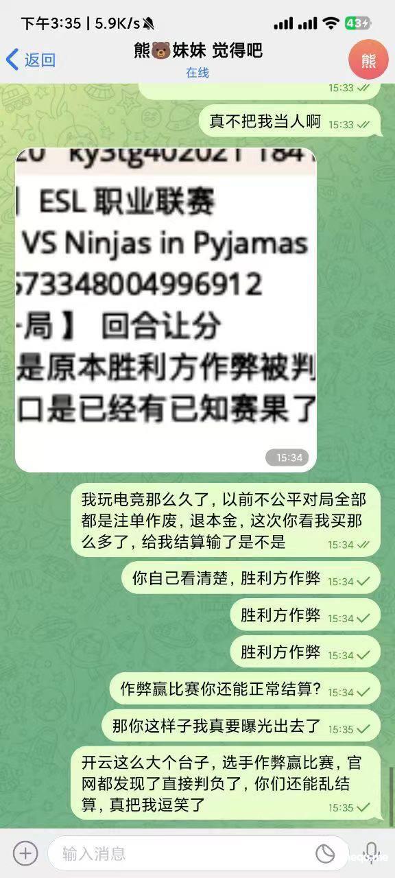 最好笑的是你们经理还给我说选手作弊了,为什么注单要作废,你们平台真是牛逼,会员投注违规就封号,选手作弊违规了就是正常的,按作弊比分来正常结算是吗