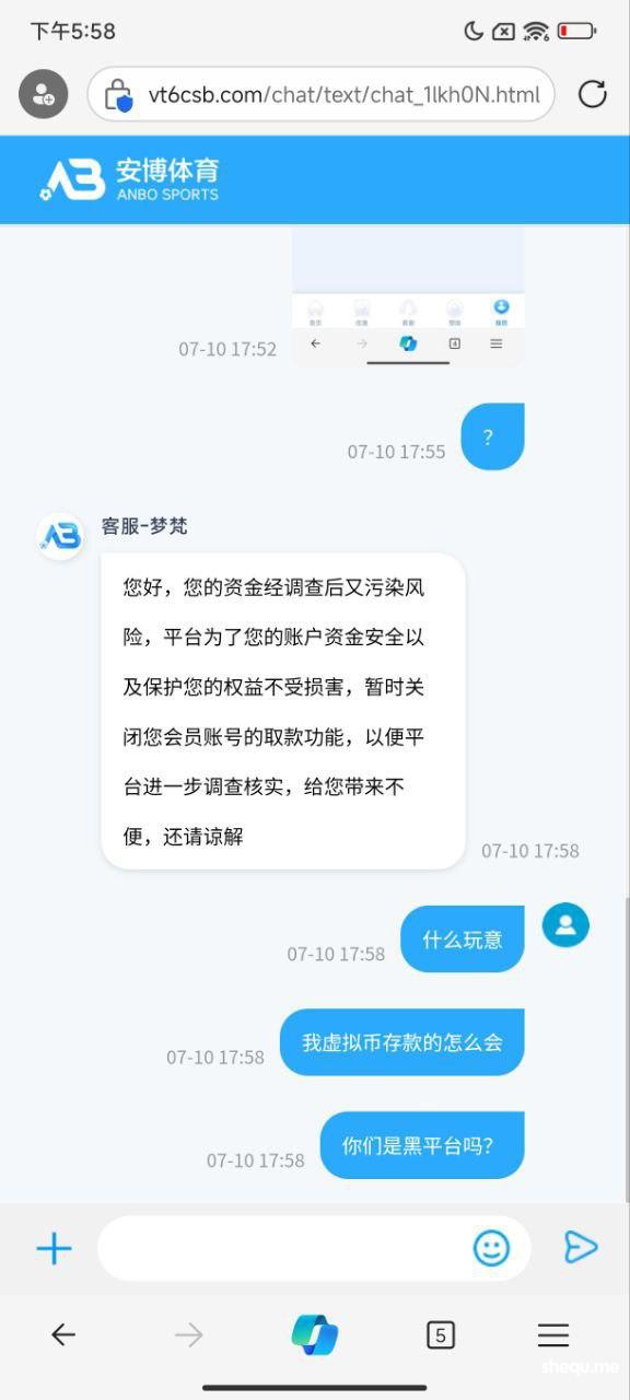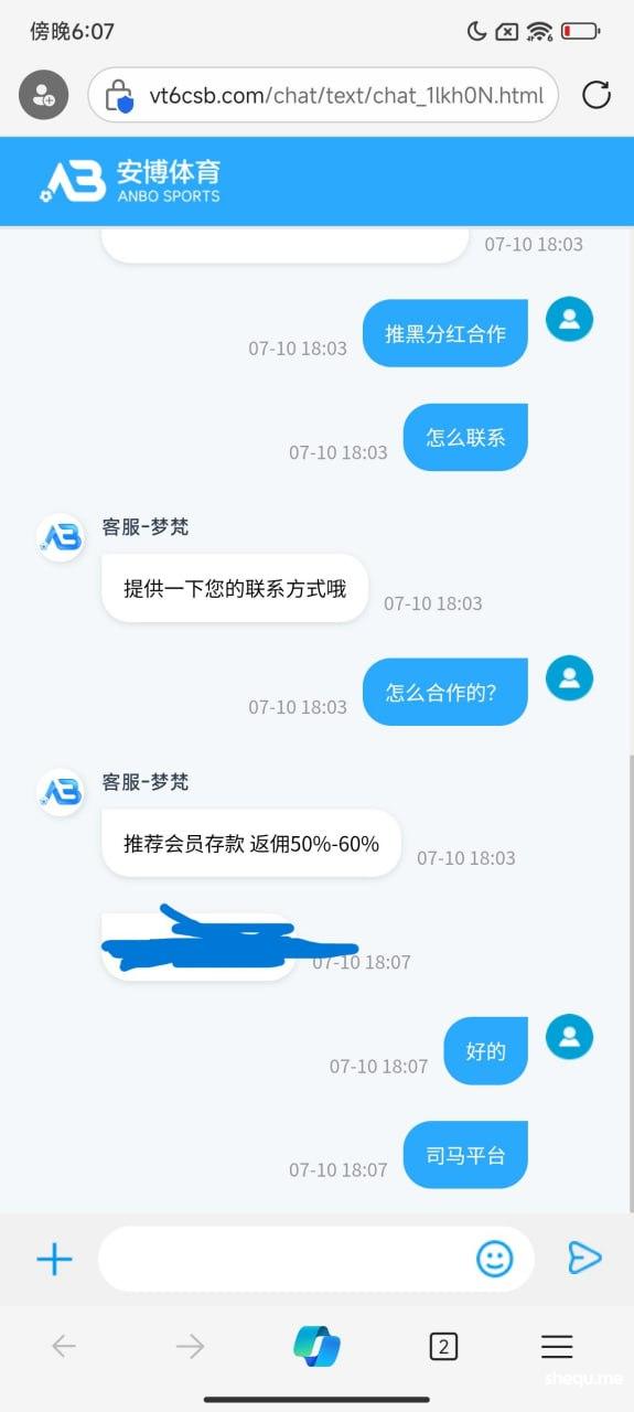 安博体育是个黑台子,不知道从哪弄得我电话号码,给我打电话说体育有包赔活动,我就冲了3万,打了差不多5万流水,提款给我拒绝,想着少提一点试试,结果提1000块都不给出,死妈玩意,这是我给朋友代买球的钱,现在身边的朋友都在找我赔付,台子不给我出款,说我账号有污染风险?头一次听到这么荒唐的理由,污染风险?我听到这个理由我是又想哭,又想笑,后来我试探的问了一下,怎么合作?他们直接不装了,拉人返佣,这不就证实了,妥妥的黑台子么,杀人不见血,吃人不吐骨头,现在的网赌还有真实的吗?