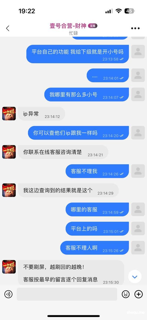 7.27我在 南宫 系列平台【壹号】充800一天赢了21w 4w分转给了下级玩  1w自己提了 分了几笔提 几个小时才到 故意延迟到账时间 然后我最后输到7w梭哈中了 15.7w 没有几分钟就把我账号黑了 我的下级们也都封了不给解封 前面说我开小号 转移分 我本来就是可以体现自己的分 打了五十多万流水 后面就是频繁转分 触发风控 不予处理 代理玩家请擦亮眼睛