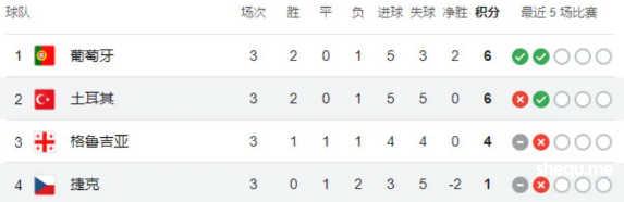 积分榜方面,葡萄牙6分头名出线,土耳其6分第二出线,格鲁吉亚4分第三出线,捷克1分垫底出局。